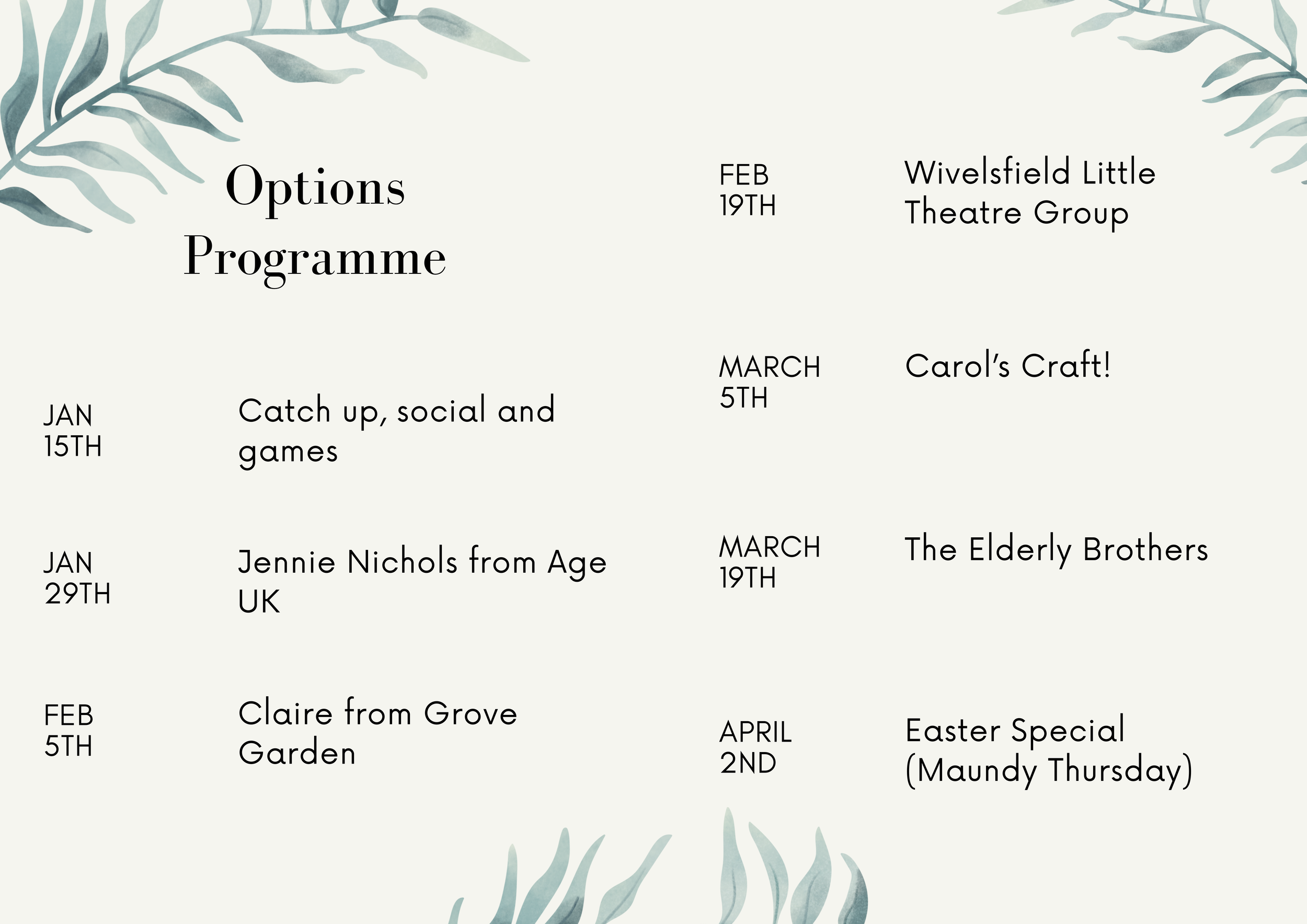 Options is a group for our older friends and church members. We have a varied programme, with speakers, quizzes, musical afternoons, chair aerobics set to music, and more! We always have tea and home made cakes and a spiritual thought for the week. There are also cream teas, visits and a Christmas party.
